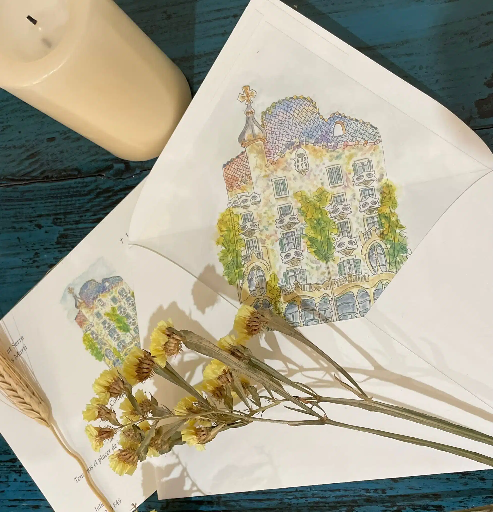 Todo es 100% personalizado para cada boda. Los meseros son ilustraciones en acuarela (lugares, temáticas o elementos de vuestra historia) y en el sobre puedo incluir una ilustración a medida: por ejemplo, el lugar donde os pidieron matrimonio.